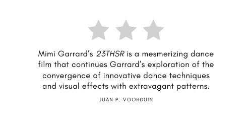 Mimi Garrard’s 23THSR is a mesmerizing dance film that continues Garrard’s exploration of the convergence of innovative dance techniques and visual effects with extravagant patterns.