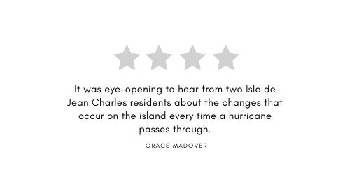 Directed by Emmanuel Vaughan-Lee, Isle de Jean Charles gives viewers a look into how drastically the island has changed since the 1970’s. When Isle de Jean Charles resident, Edison Dardar, grew up on the island, there were around 300 homes. Today there are only 20 homes left on the island. It was eye-opening to hear from two Isle de Jean Charles residents about the changes that occur on the island every time a hurricane passes through. They explain that each time they must evacuate. After the storm, many residents cannot return to the island because their homes have been demolished.